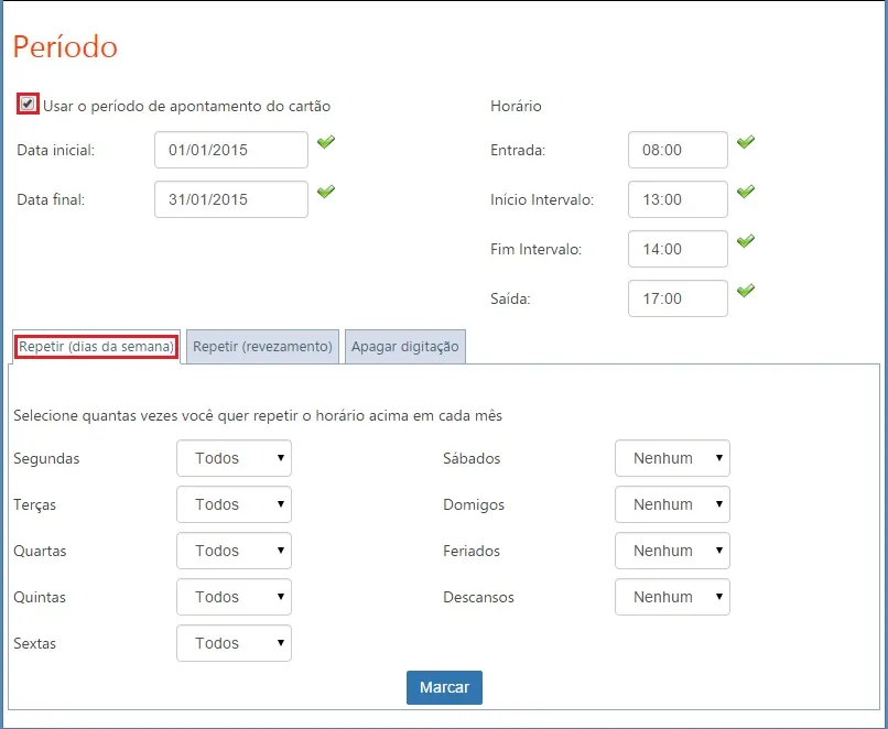 Você pode automatizar o preenchimento de horas no espelho do cartão de ponto. Ao clicar em "Repetir a digitação", configure o horário de entrada, intervalo e saída e em quantos dias da semana essa repetição ocorrerá. Clique em "Marcar" para aplicar as configurações no espelho do cartão de ponto.