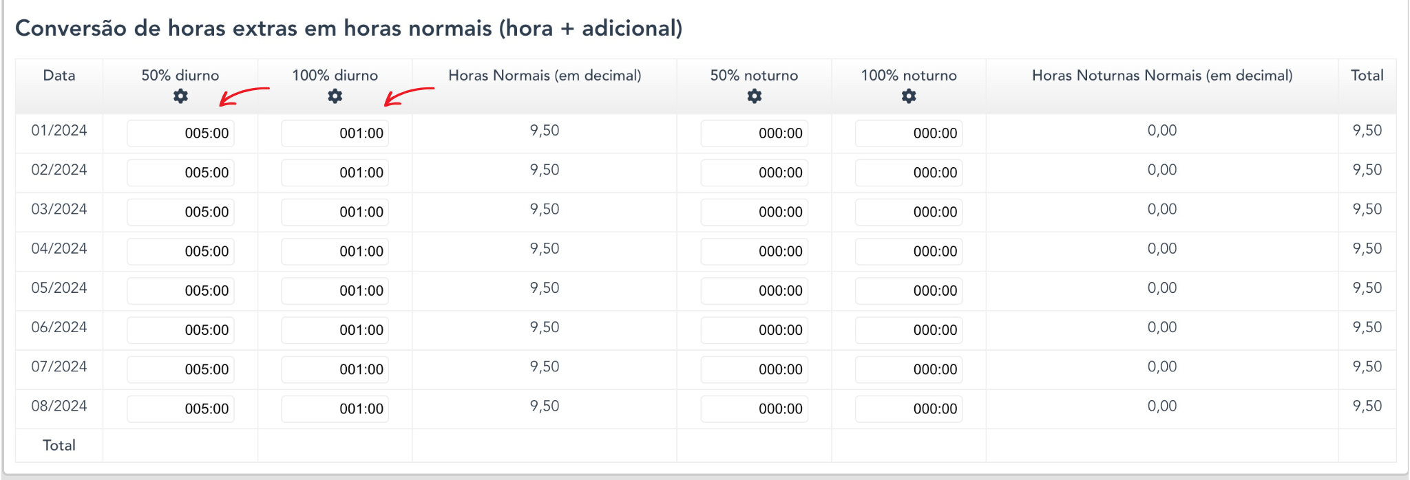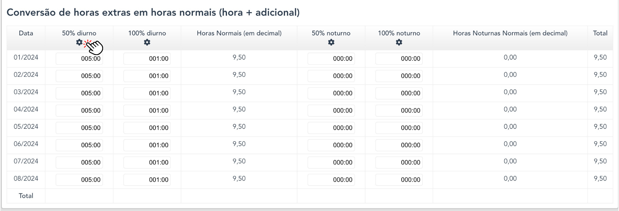 Respeite a porcentagem em cada coluna. Caso queira informar outras porcentagens para conversão de horas extras, clique sobre a roda dentada: