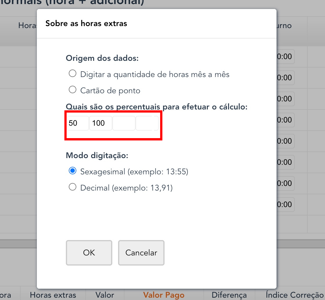 Na janela de diálogo "Sobre as horas extras", configure novas porcentagens para conversão de horas extras. Digite os valores em porcentagem e clique em "OK":