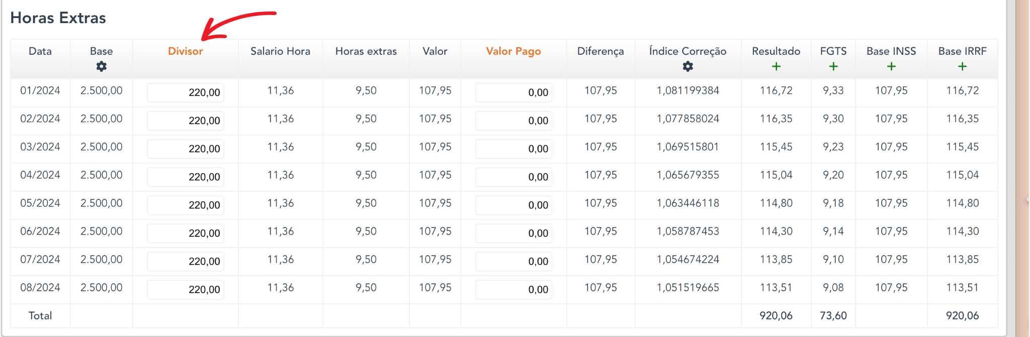 Na tabela "Horas extras", informe nos espaços editáveis em laranja, o divisor mensal. Informe se ocorreu algum valor pago.