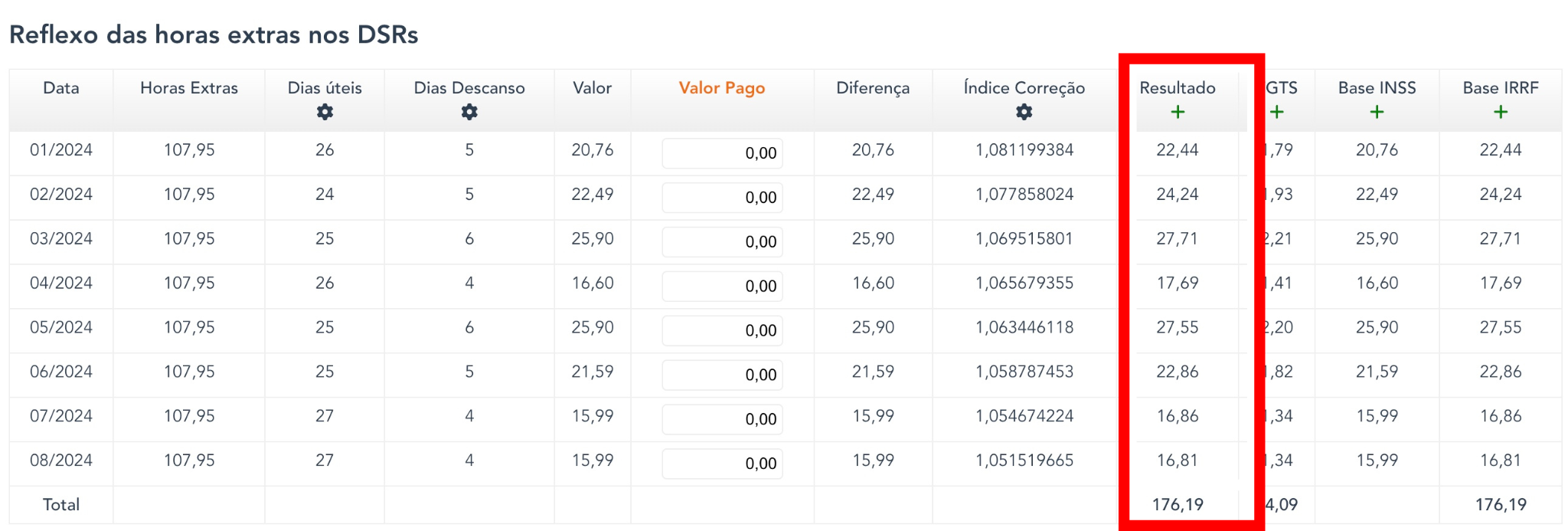 O exemplo acima deve ser entendido por: na tabela de conversões de horas extras, estou informando quantas horas extras a 50% diurnas foram feitas durante cada mês trabalhado, assim como quantas horas a 100% diurnas foram feitas durante os meses trabalhados.