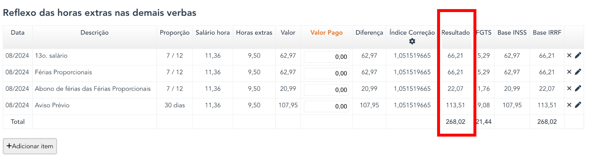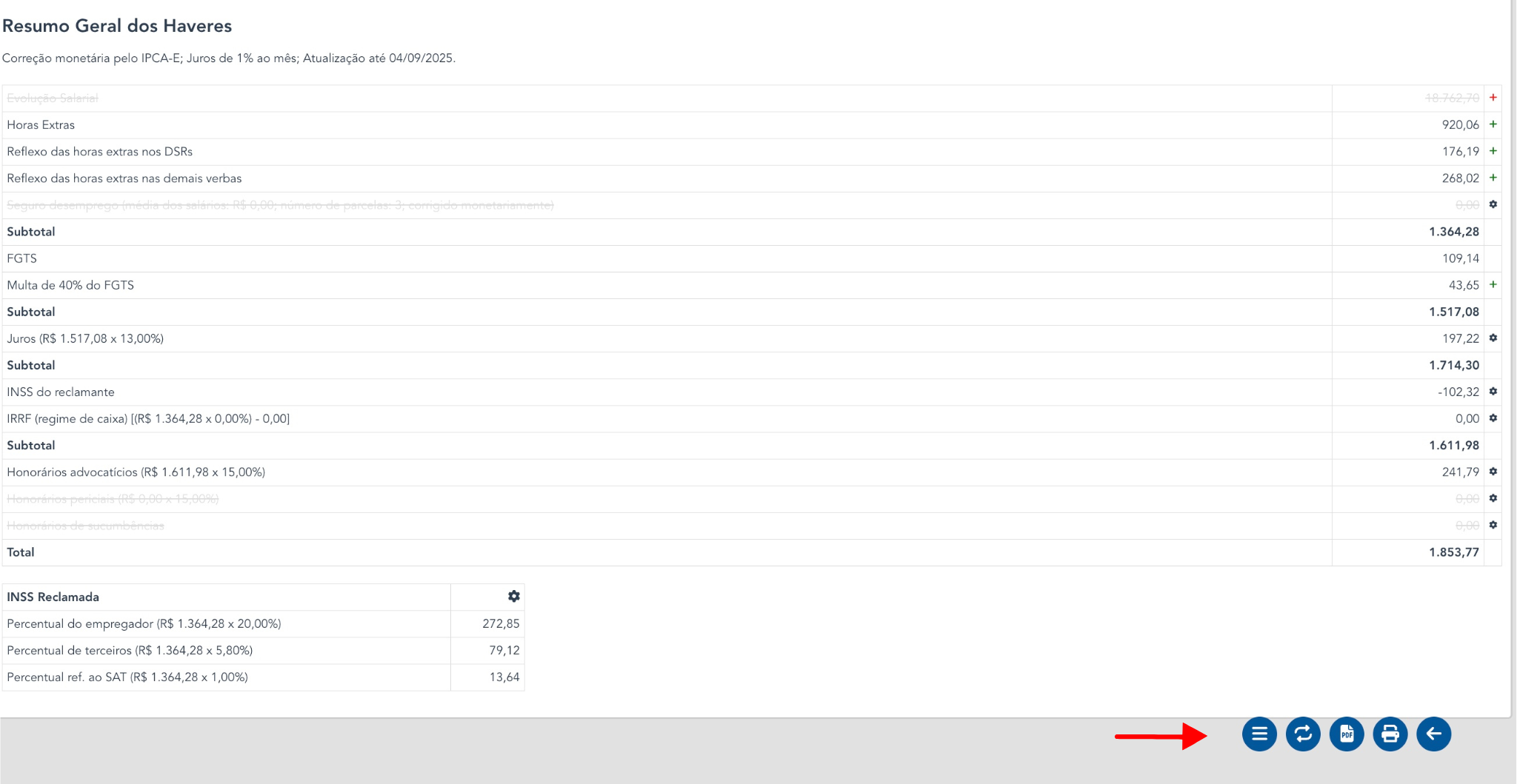 A tabela com "Resumo Geral dos Haveres" traz o relatório final com informações gerais sobre o cálculo. É possível consultar o resultado das verbas calculadas junto aos reflexos nos DSRs e demais verbas.