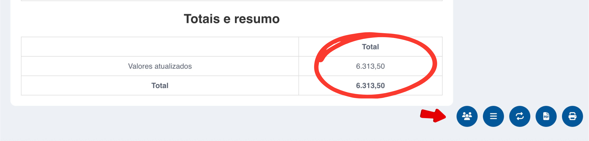 A seguir o cálculo esta pronto, com os valores atualizados e você tem as seguintes opções abaixo: compartilhar e imprimir.