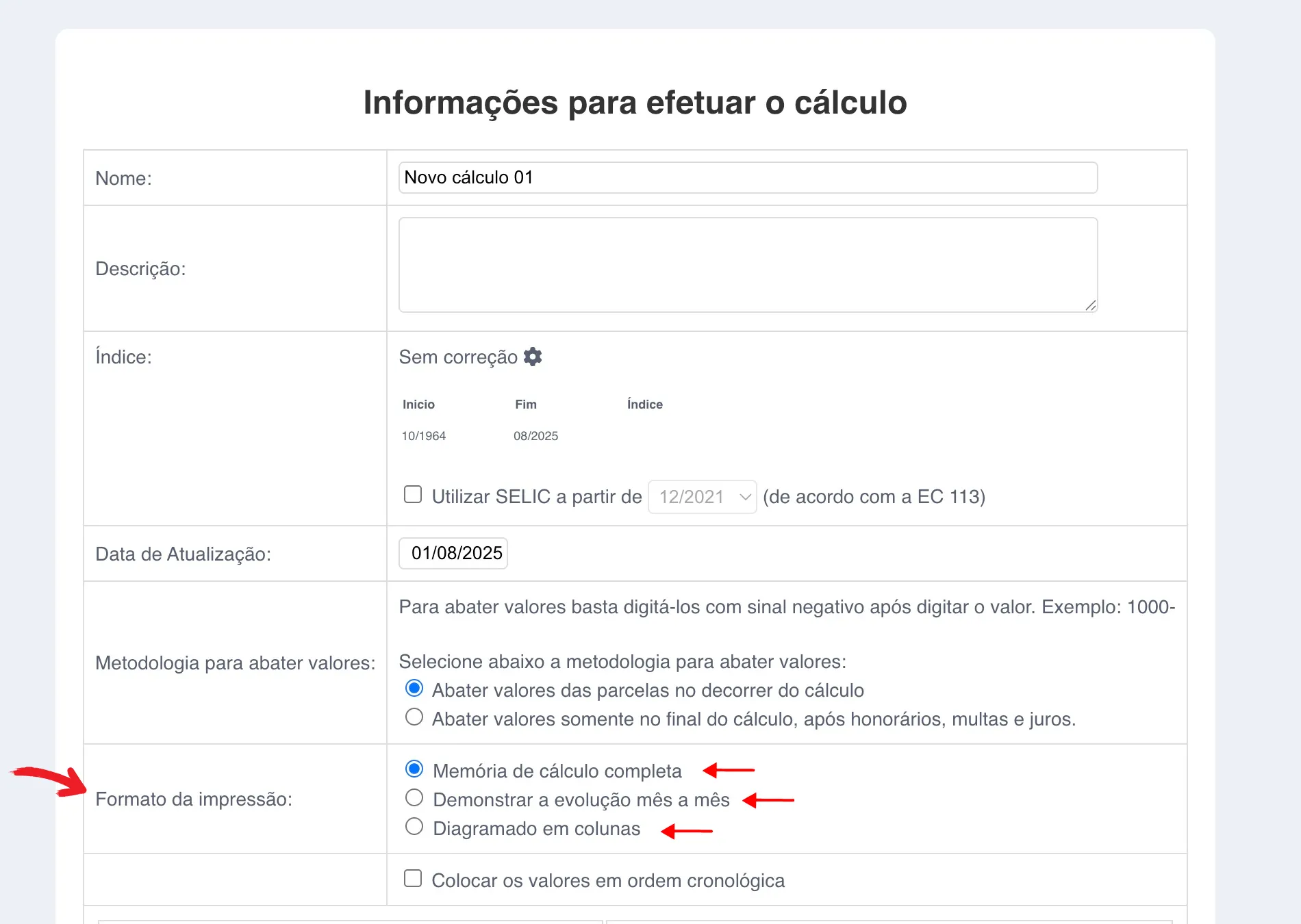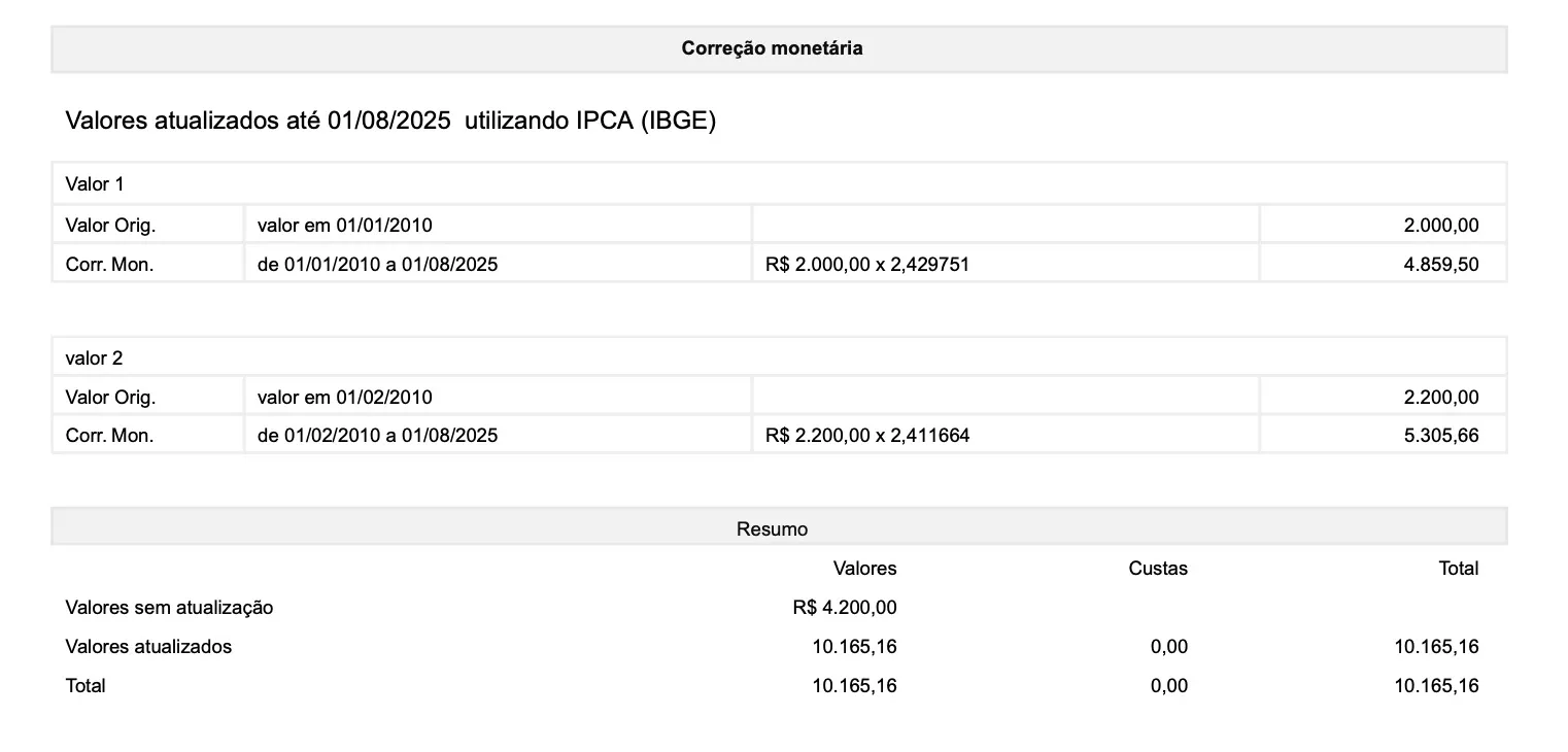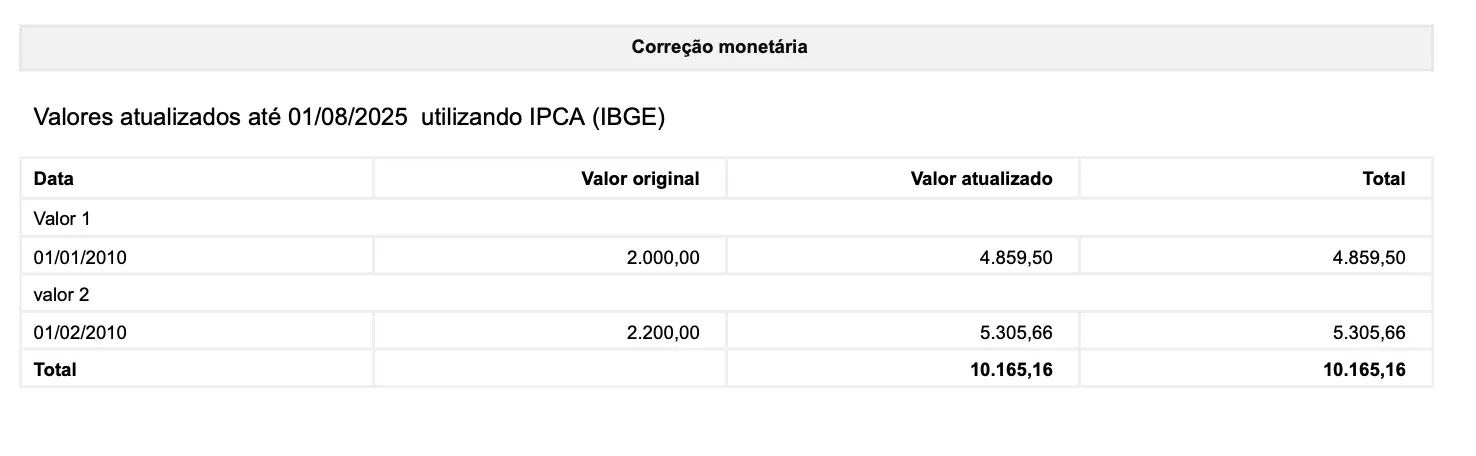 A demonstração da evolução mês a mês de seu cálculo representa minuciosamente as atualizações de determinado valor, mensalmente. No exemplo a seguir, um valor com data 01/01/2010 foi atualizado até 01/08/2025, com índice IPCA (IBGE) para correção monetária. Observe o exemplo: