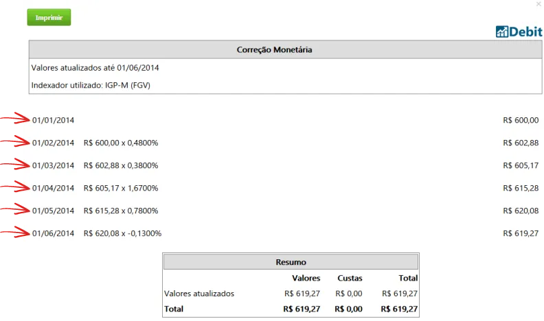 Ao selecionar a exibição da memória de cálculo completa, você terá acesso às informações detalhadas que configurou em seu cálculo: o valor original, a correção monetária sobre o valor, o indexador utilizado para efetuar esta correção, a data do valor, juros, multa, honorários, custas e total. Observe o exemplo: